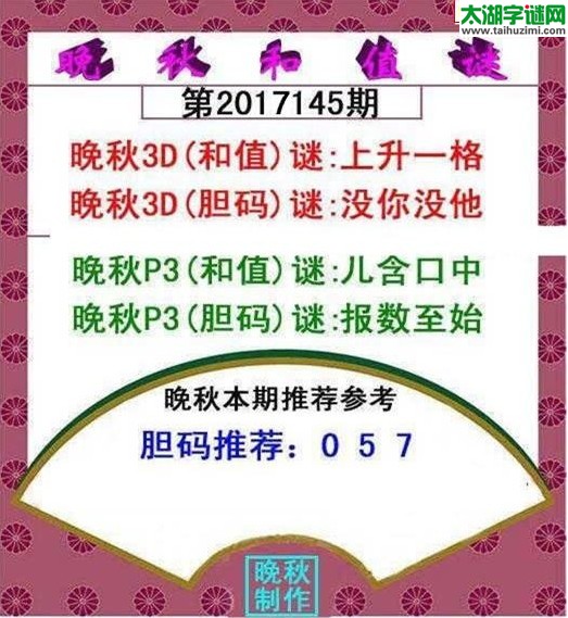 2017145期P3晚秋(和值)谜:儿含口中 D:报数至始