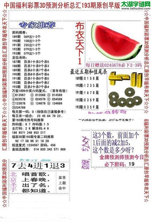 3d193期:于海滨彩票工作室 一句定三码图