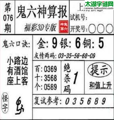 3d076期:鬼六神算图库福彩3d胆码图