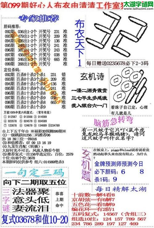 狙击手解3d第18099期:太湖3d字谜之-十前