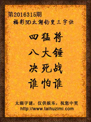 2016年福彩3d第315期太湖钓叟字谜:四猛将,八大锤,决死战,谁怕谁