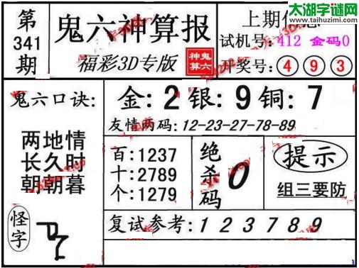3d341期:天宇图谜(胆码杀号+必买五码)