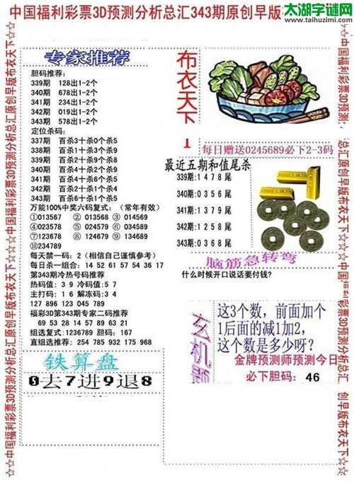 3d343期:天宇图谜(胆码杀号+必买五码)