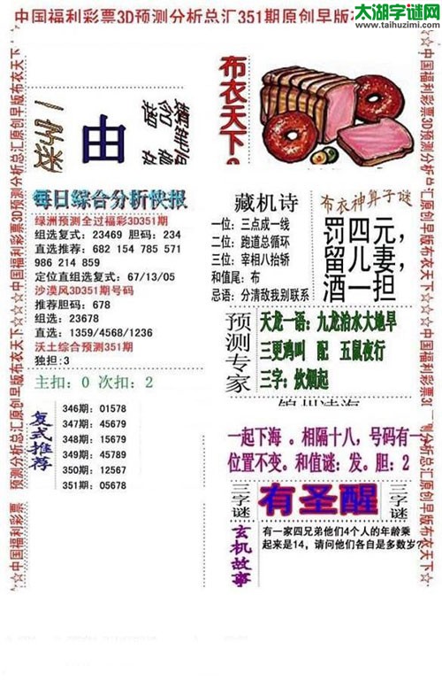3d351期太湖字谜:俩酒盅,装满酒,碰一