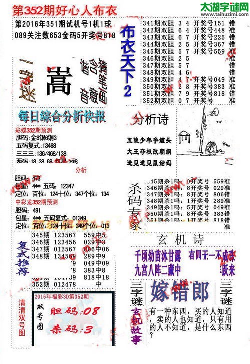 [如梦繁华]解第2016352期太湖:燕舒尾,