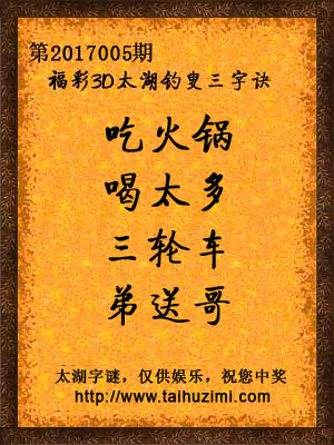 2017年福彩3d第005期太湖钓叟字谜:吃火锅,喝太多,三轮车,弟送哥
