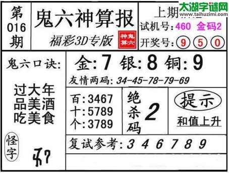 3d016期:鬼六神算图库福彩3d胆码图
