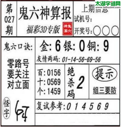 3d027期:鬼六神算图库福彩3d胆码图