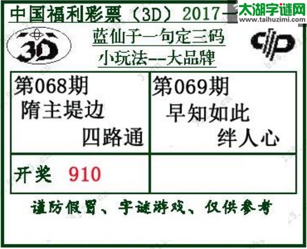蓝仙子一句定三码第2017069期3D图谜:早知如此 绊人心