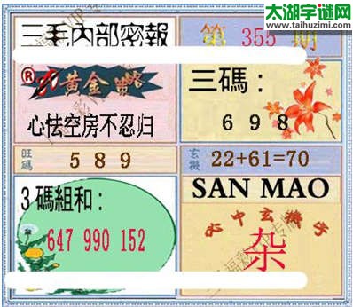 【三毛图谜355期】三码推荐:698,旺码:589.三码组合:647 990 152