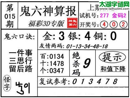鬼六神算015期胆码:340,绝杀一码:9,复式参考:01348,提示:和值下降