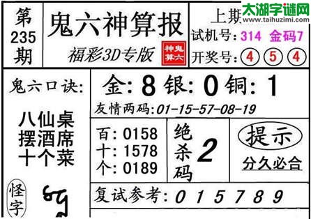 3d235期:【鬼六神算】胆码图+绝杀一码