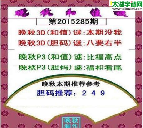 2015285期3d晚秋和值谜:本期没我 D:八要右半