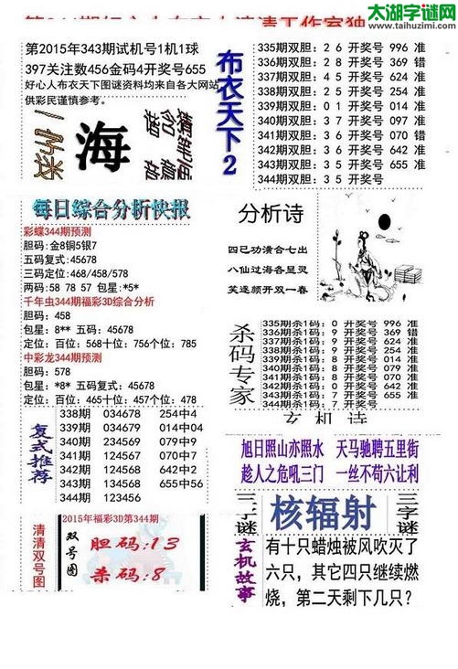 乐搏乐呵解太湖字谜15344期:胆码预测