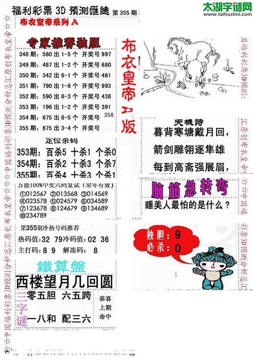 3d355期:天宇图谜(胆码杀号+必买五码)