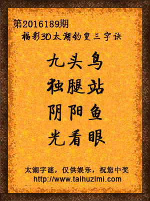 2016年福彩3d第189期太湖钓叟字谜:九头鸟,独腿站,阴阳鱼,光看眼