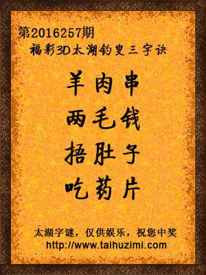 2016年福彩3d第257期太湖钓叟字谜:羊肉串,两毛钱,捂肚子,吃药片