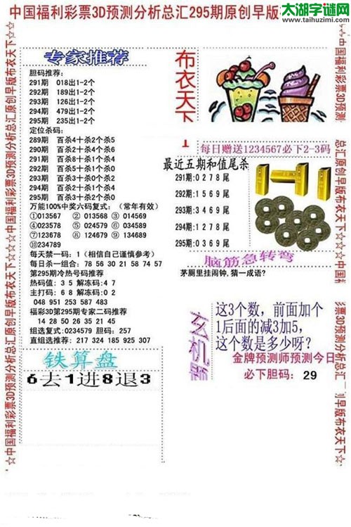3d295期:天宇图谜(胆码杀号+必买五码)