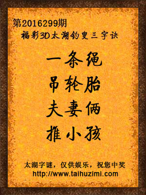 2016年福彩3d第299期太湖钓叟字谜:一条绳,吊轮胎,夫妻俩,推小孩